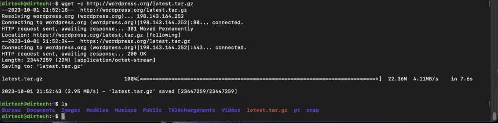 wget -c http://wordpress.org/latest.tar.gzCette commande télécharge le fichier compressé latest.tar.gz qui contient les fichiers de WordPress.