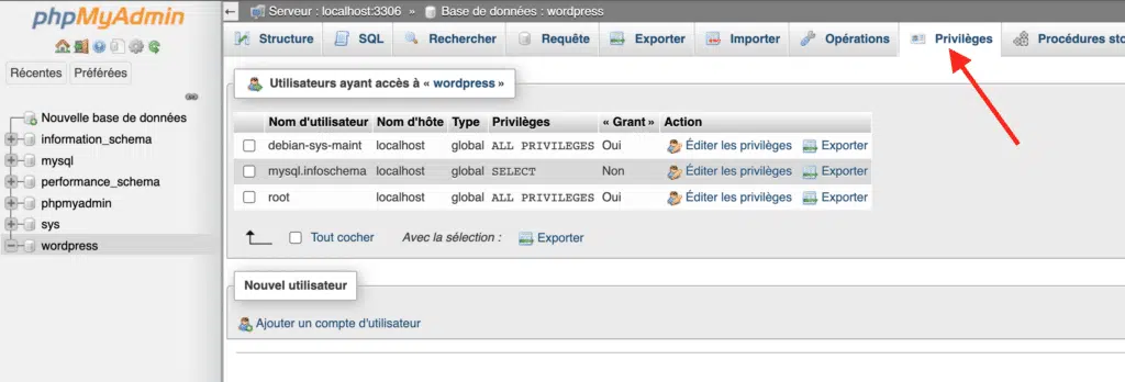 Allez dans l’onglet Privilèges : Cliquez sur l’onglet ‘Privilèges’ en haut de la page.