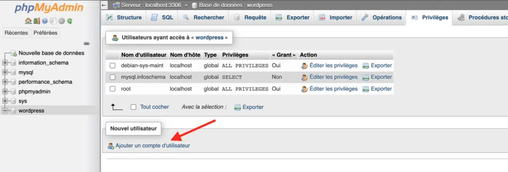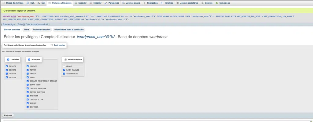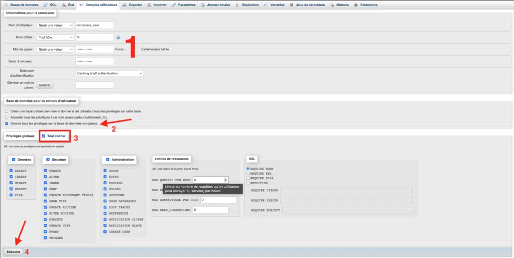 Configurez l’utilisateur : Entrez un nom d’utilisateur, un mot de passe et configurez les privilèges selon vos besoins. Assurez-vous d’attribuer tous les privilèges à cet utilisateur pour la base de données que vous venez de créer.