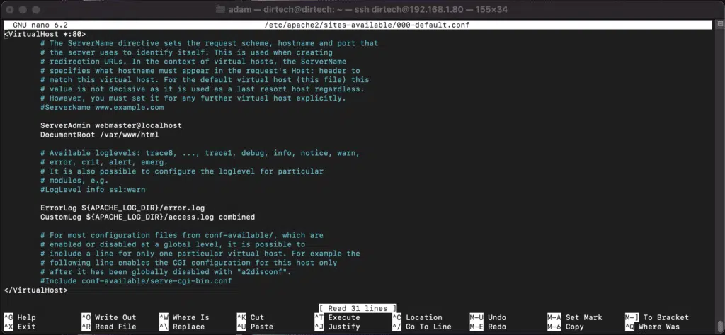 sudo nano /etc/apache2/sites-available/000-default.confModifiez les paramètres du VirtualHost : Dans le fichier ouvert, localisez la section et modifiez les paramètres pour qu’ils correspondent à ce qui suit :