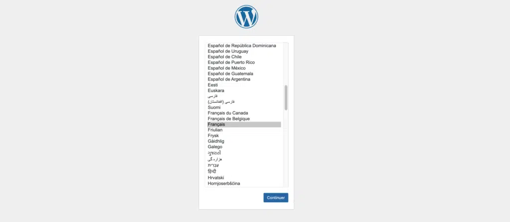 Sélectionnez la langue : Une fois sur la page d’installation, sélectionnez la langue dans laquelle vous souhaitez installer WordPress, puis cliquez sur ‘Continuer’.