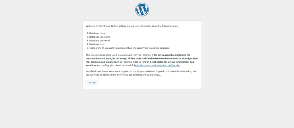 Vous devriez voir la page d’installation de WordPress s’afficher, confirmant que la configuration d’Apache est correcte.